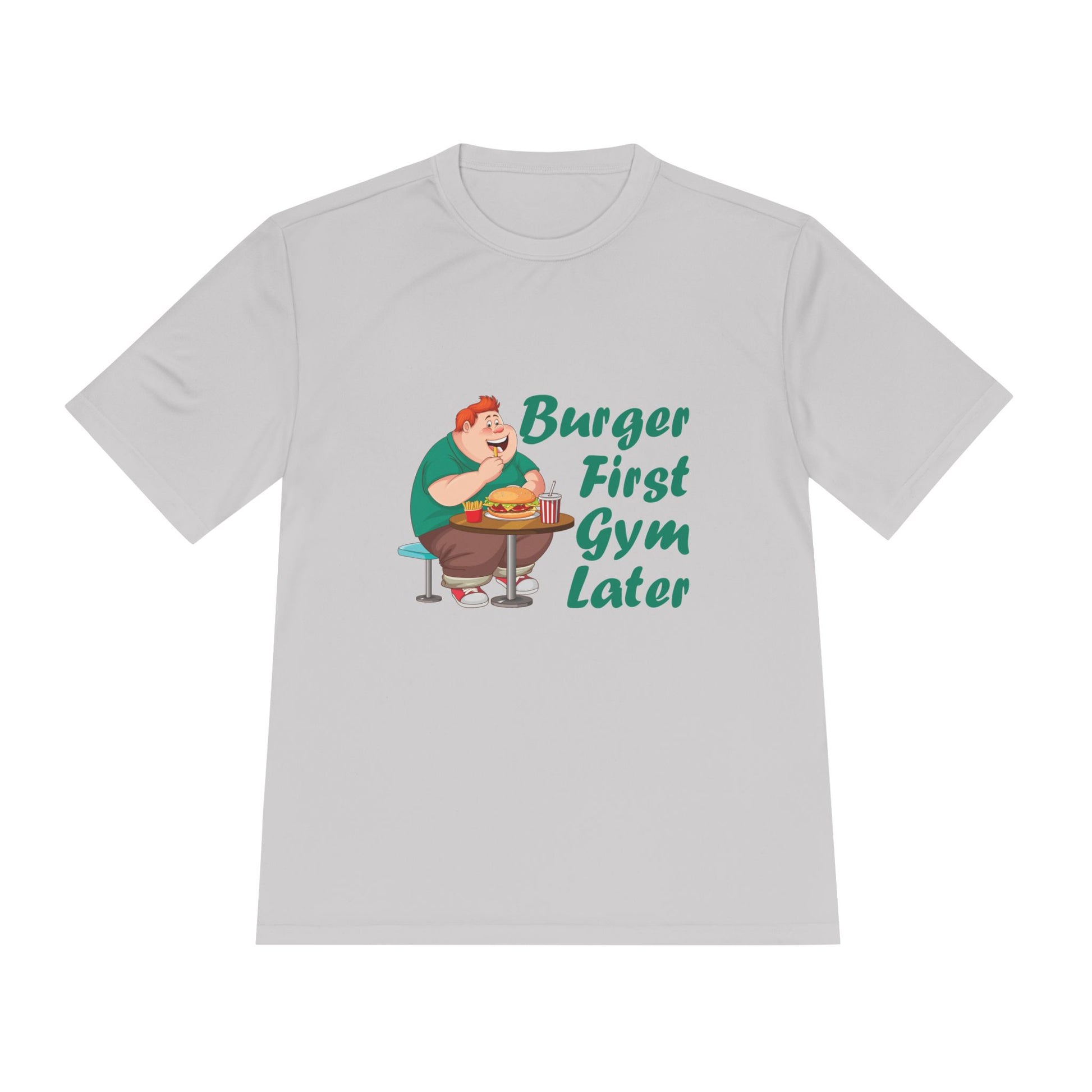Swap the heavy gym talk for a laugh and a laid-back shrug. This lightweight moisture-wicking tee wears the slogan “Burger First, Gym Later” like a wink — casual, confident, and a little rebellious. It sits light on the skin and moves with you whether you’re pacing to a workout class or standing in line at your favorite burger spot. The cheeky message starts conversations and lets others know you balance effort with enjoyment. Wear it after a long shift, on cheat-day runs, or while planning the next training cycle with a burger on your mind.