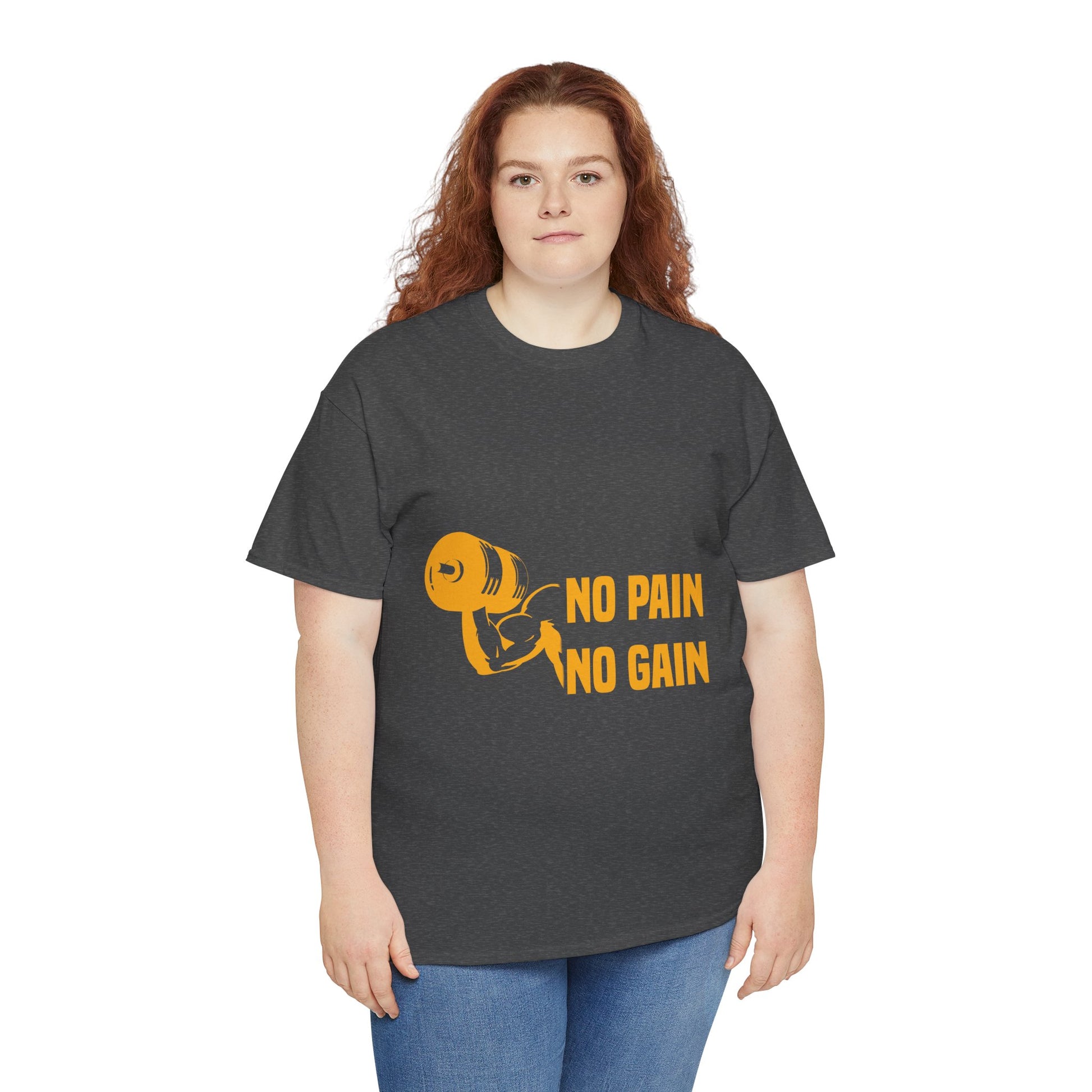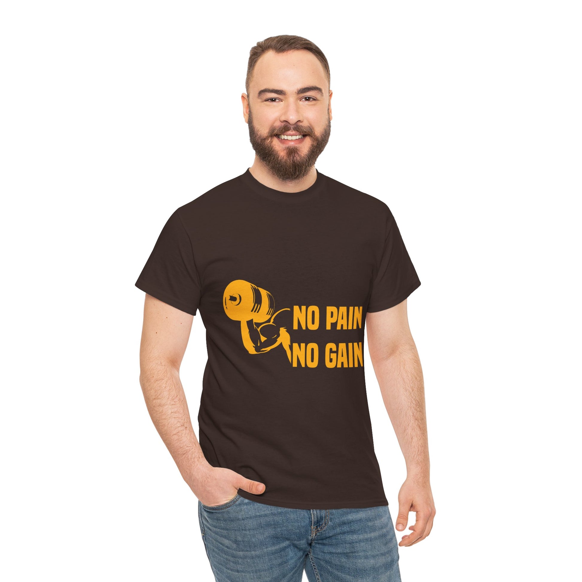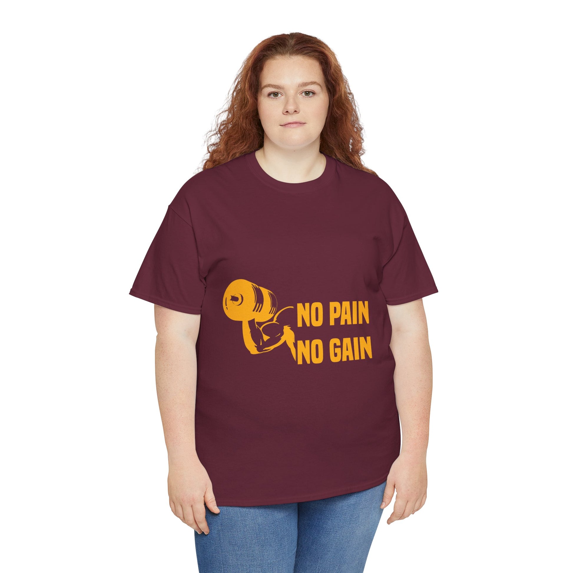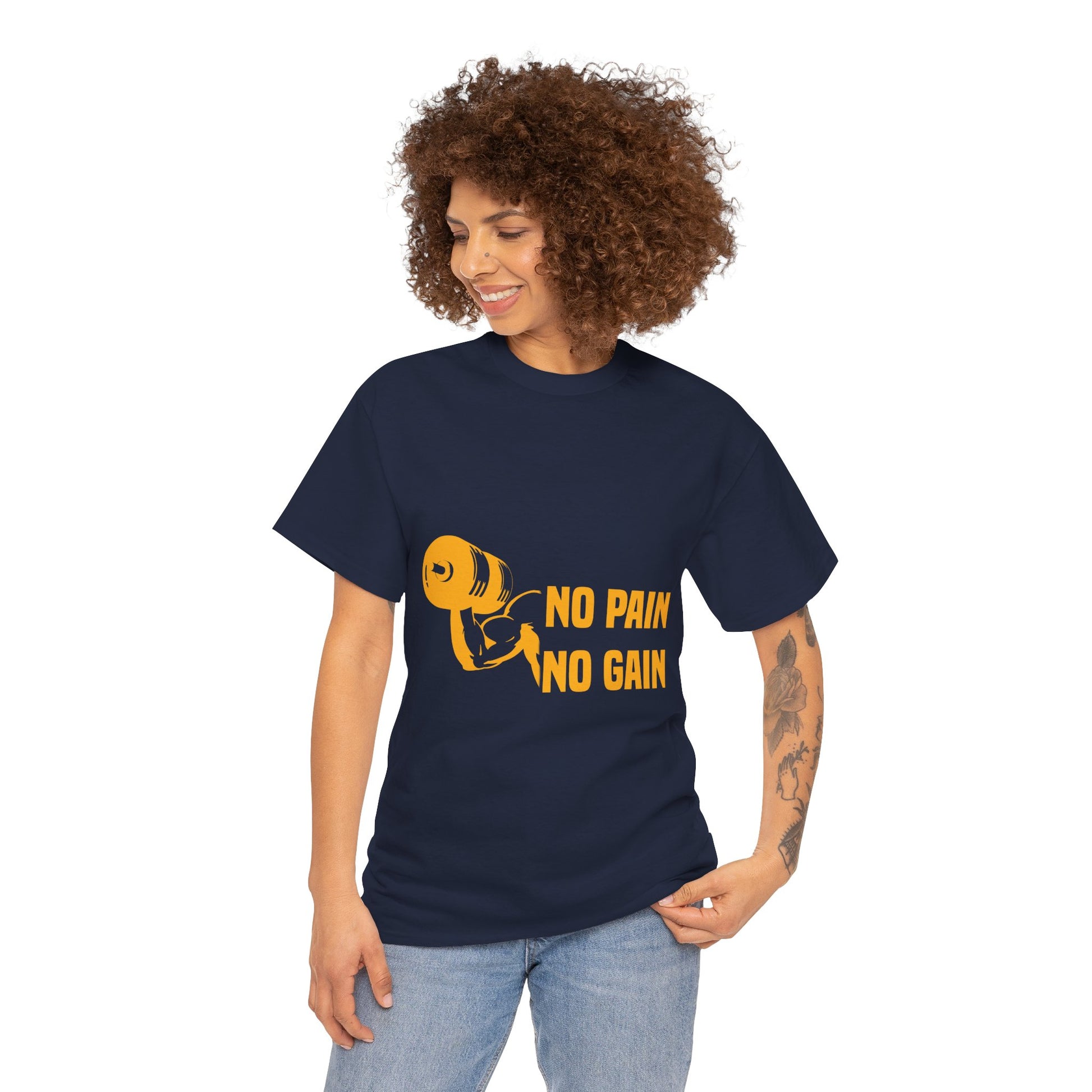 This fitness tee carries a focused, no-nonsense energy — a soft, sturdy crew shirt printed with the bold "No Pain No Gain" bodybuilding message. It sits comfortably on the shoulders and holds its shape through heavy use, so it becomes a trusted part of your training rotation. Wear it during early-morning lifts, sweat-dripping HIIT sessions, or on the walk home when your muscles still hum. The shirt’s clean, athletic silhouette reads deliberate, not flashy, and the strong, detailed print stays crisp wash after wash. It’s for people who measure progress in reps and miles, who respect the grind and want their clothing to reflect that quiet confidence.